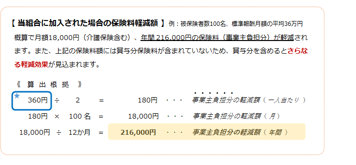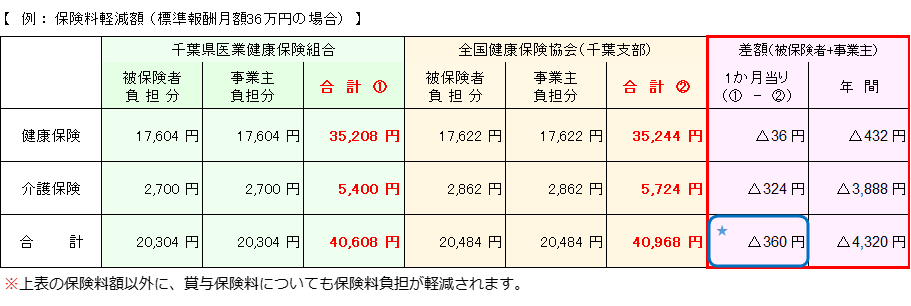 上表の例(標準報酬月額36万円の被保険者)で比べると、保険料(介護保険も含む)が年間で4,320円軽減されます。