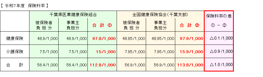 当健康保険組合(以下、当組合)では、全国健康保険協会千葉支部(以下、協会けんぽ)の保険料率より 0.1/1000(介護保険料を含めると1.0/1000)低いため、事業主と被保険者の保険料負担が軽減されます。